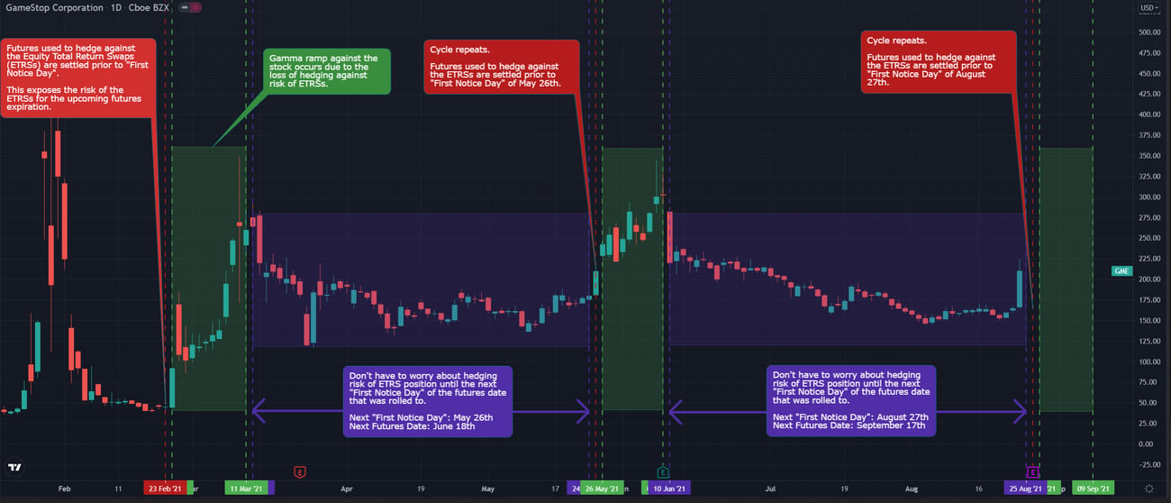Međutim kao što je rečeno, futures tip ugovora ima svoje uvjete, a među njima je djelomično zatvaranje pozicija i to po market cijeni. Prema tome svaki kvartal jedan dio futuresa oni moraju isplatiti, što uzrokuje skokove GME-a jer je potražnja za dionicama (kreirane kako bi se shortale) velika i momentum divlja.